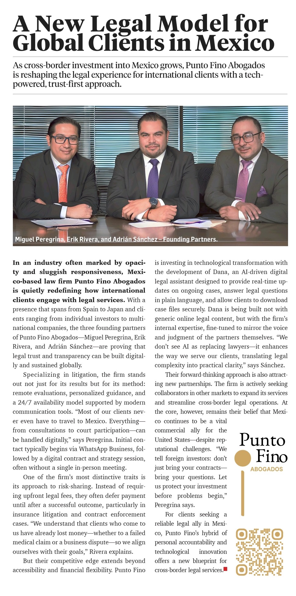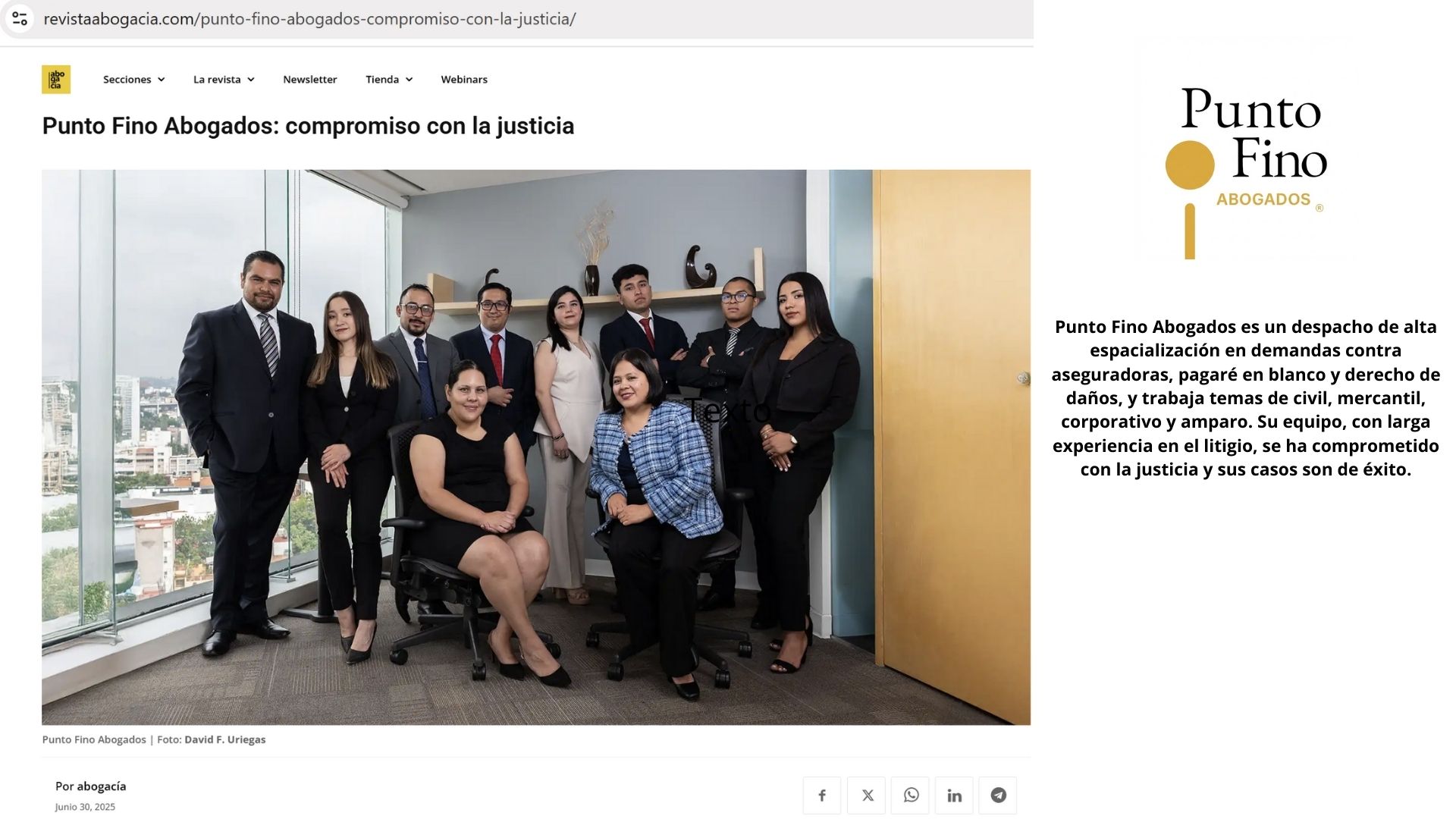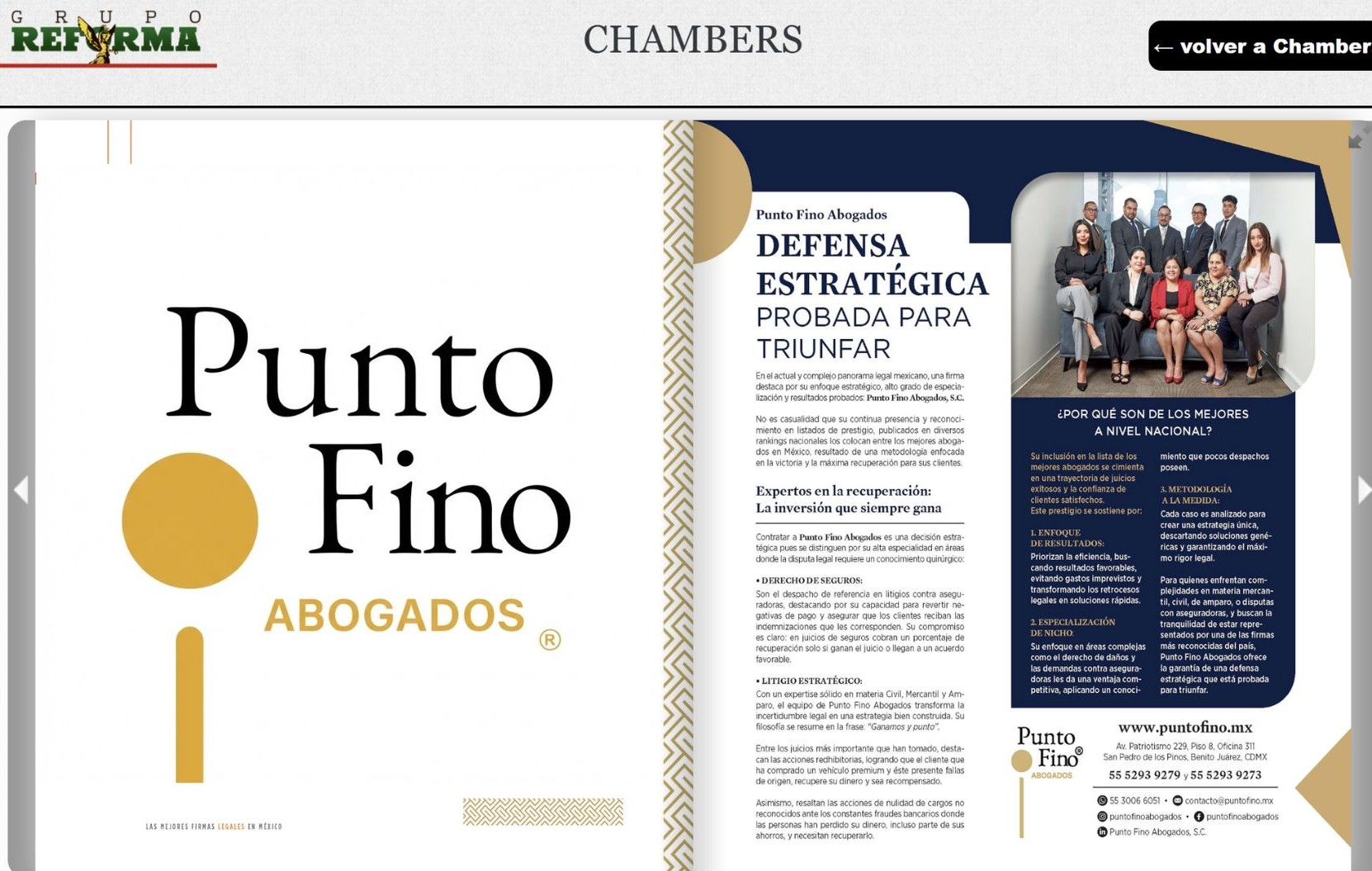 "El último año ha sido importante para Punto Fino, Abogados, S.C., ya que se consolidó dentro de los 50 Mejores Despachos de Abogados de México por diversas revistas especializadas (TOP, Consultoría, Lideres Mexicanos, Revista Abogacía, Reforma, Excelsior y Ángeles Times), por tanto, no somos abogados hablando bien de sí mismos, sino de una firma reconocida a nivel Nacional.